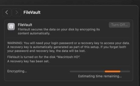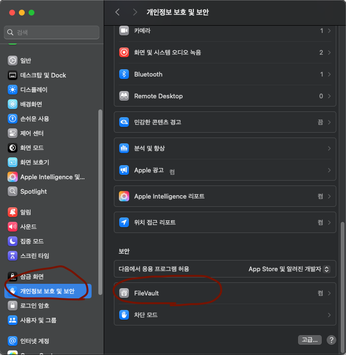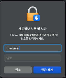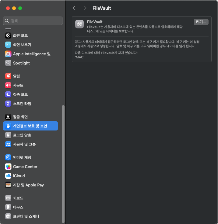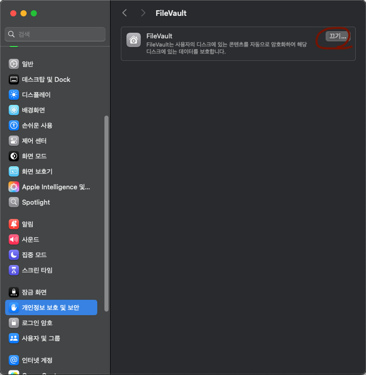 다시 시스템 설정 > 개인정보 보호 및 보안 > FileVault 으로 이동해보면